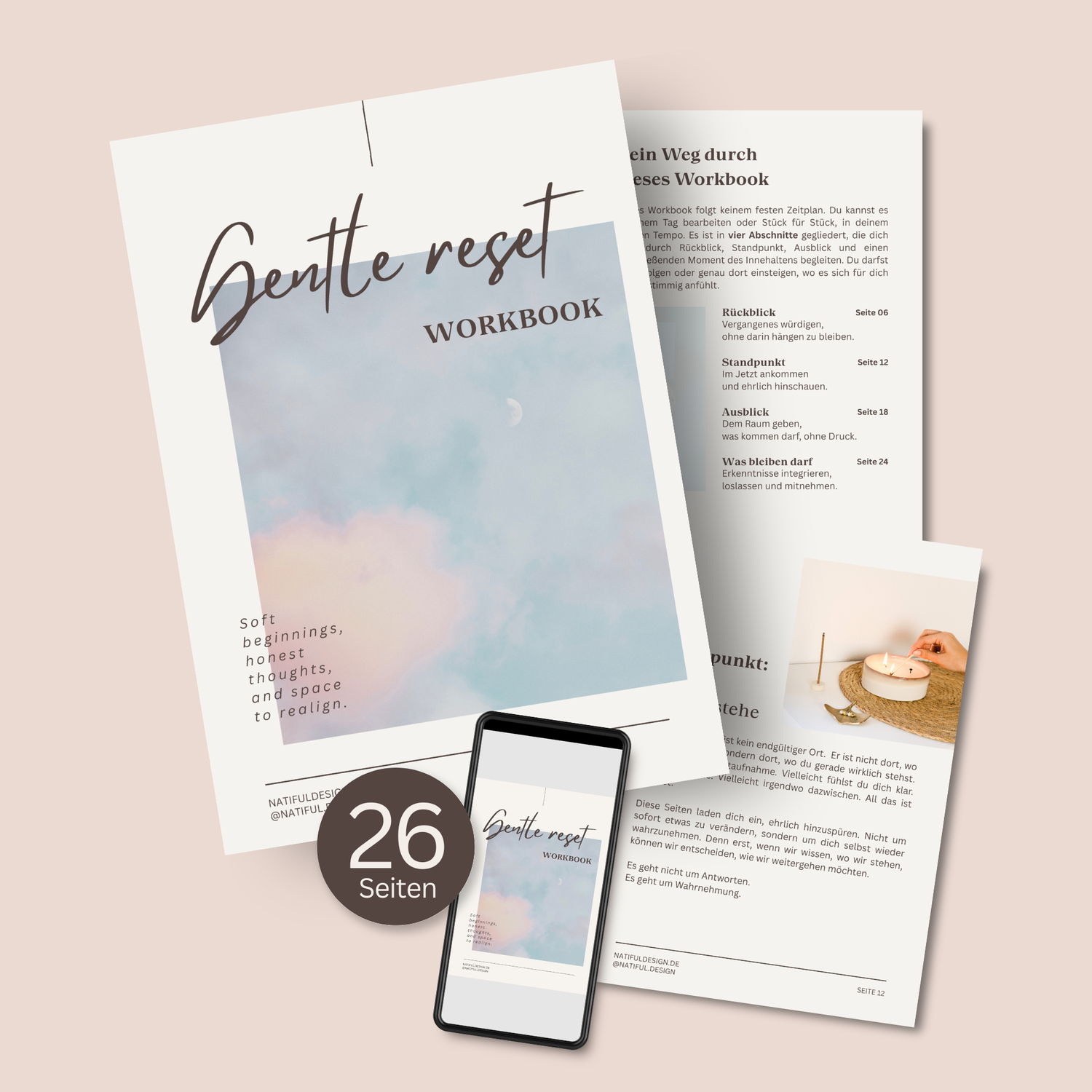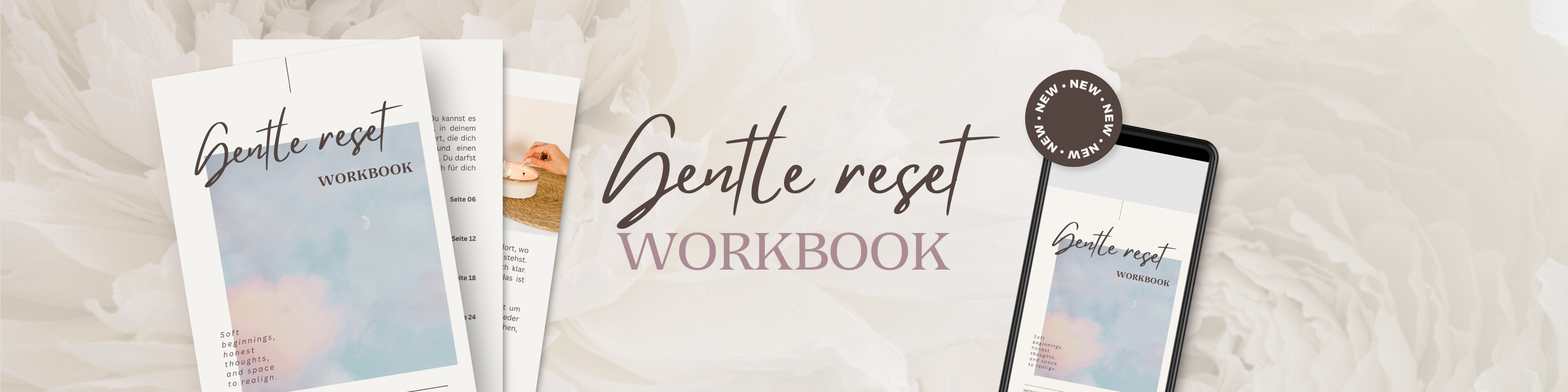 Das Gentle Reset Workbook ist eine Einladung, einen Moment innezuhalten und dir selbst wieder zuzuhören. Es begleitet dich durch Fragen, Gedankenräume und Impulse, die dir helfen können, Vergangenes zu würdigen, im Jetzt anzukommen und dem Raum zu geben, was entstehen darf. Es ist keine Anleitung zur Veränderung, sondern ein sanfter Weg zurück zu dir selbst.