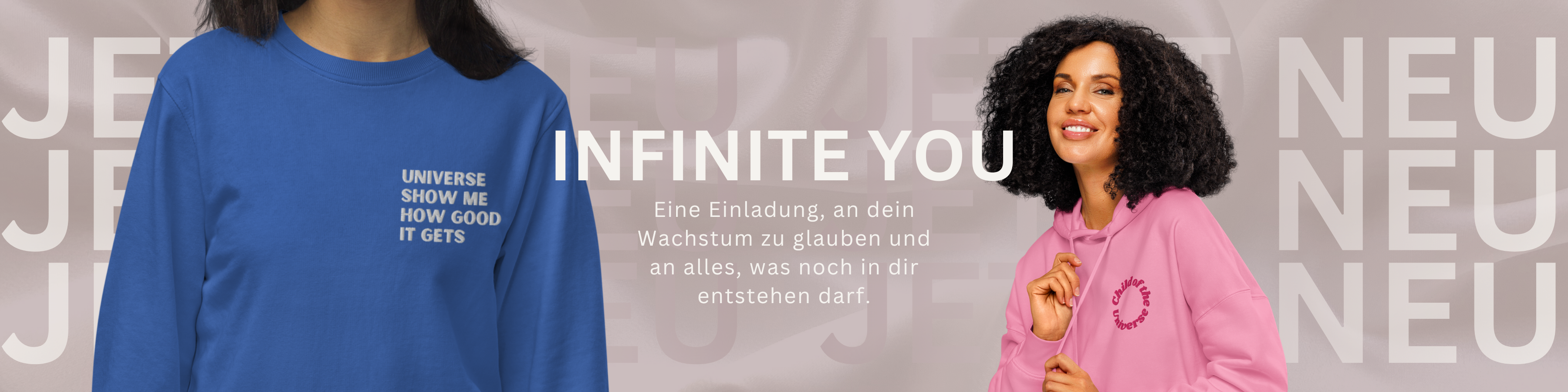 Infinite You ist eine Kollektion für all das, was kein Ende kennt. Für Entwicklung ohne Zielgerade und für Wachstum ohne Vergleich. Für dich in all deinen Versionen. Diese Kollektion erinnert daran, dass du nicht „fertig“ sein musst, es keine Ziellinie gibt, kein richtig oder falsch, kein danach. Nur Bewegung, Bewusstsein und Veränderung.